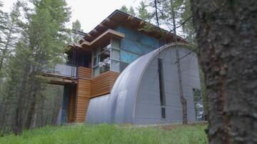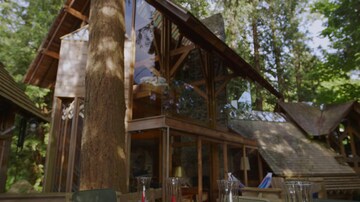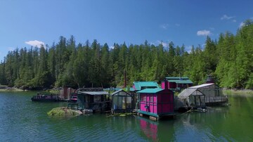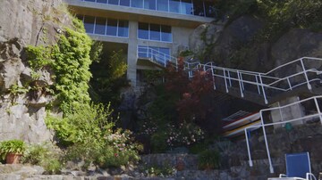Evelyne découvre la Merrick House, une maison perchée dans les arbres à l'architecture West Coast Modern. La maison irrégulière a été conçue et construite à la main par l'architecte Vancouvérois Paul Merrick dans les années 1970. Faite de matériaux recyclés, de pierres et bois indigènes, la résidence de 17 paliers a gagné de nombreux prix d'architecture, notamment pour sa grande harmonie avec la nature de la côte nord de Vancouver.